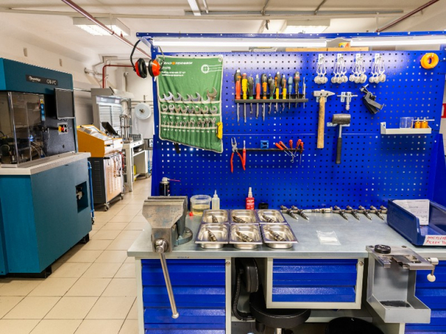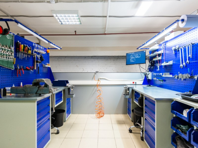 Слесарная зона на 10 постов и полностью оборудованные топливный и турбинный цеха.